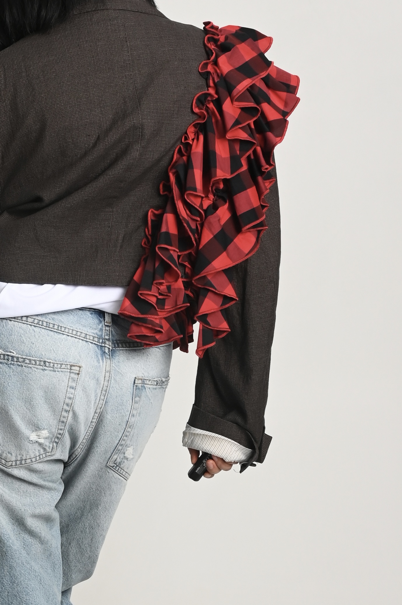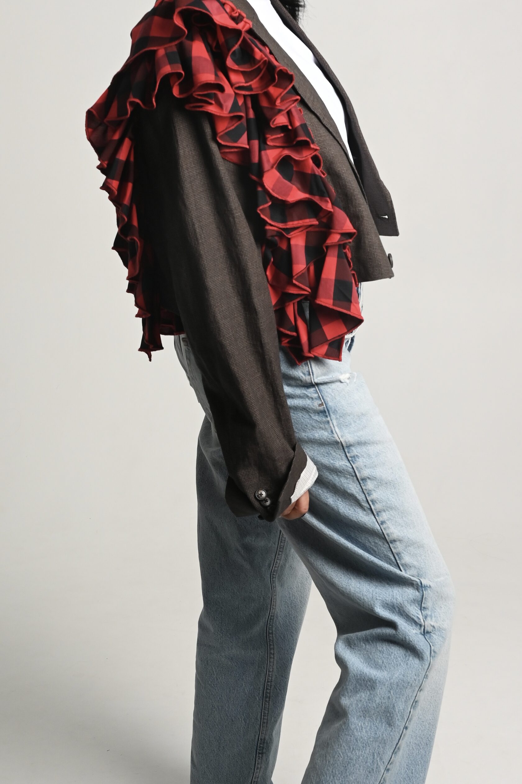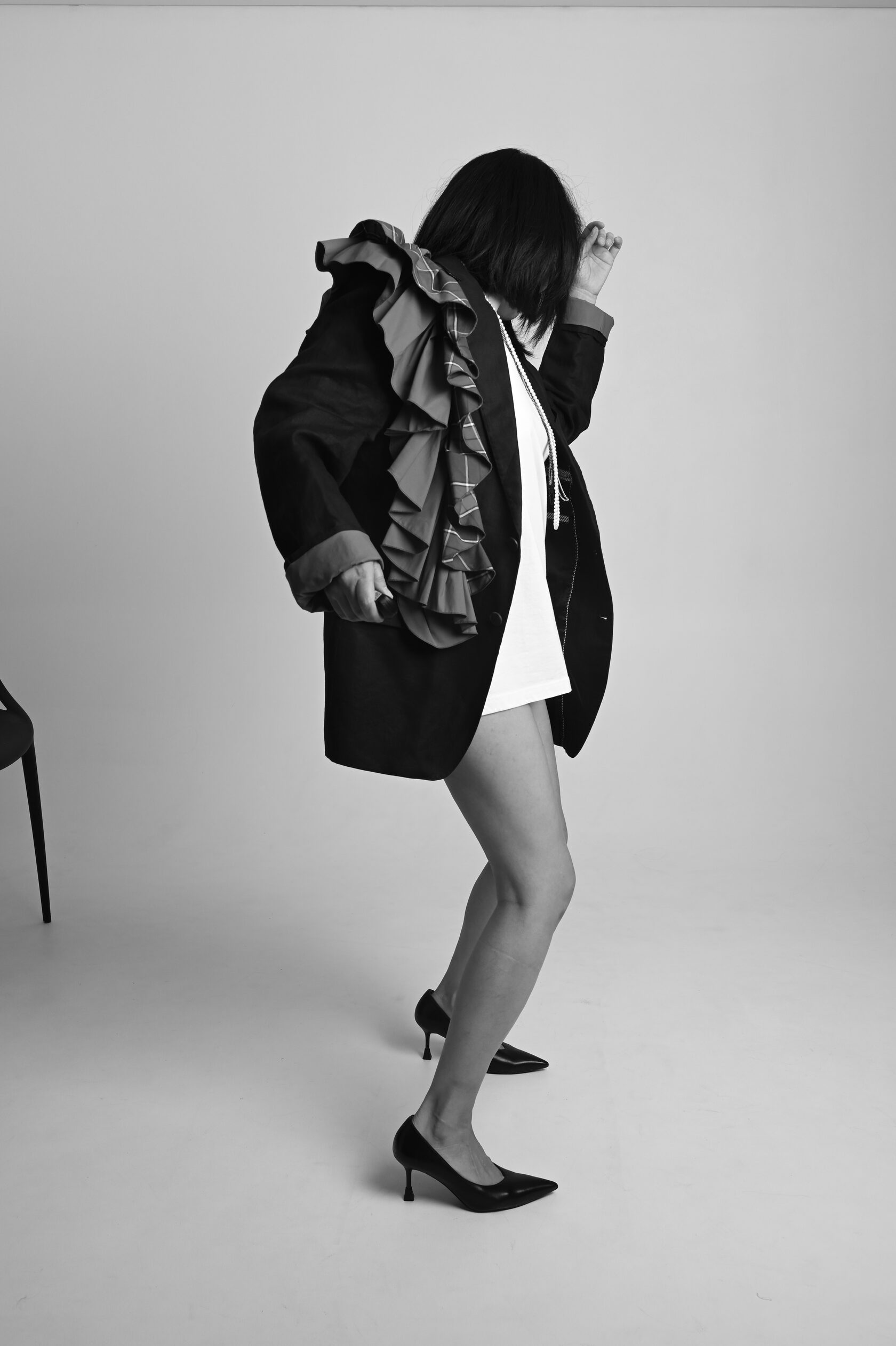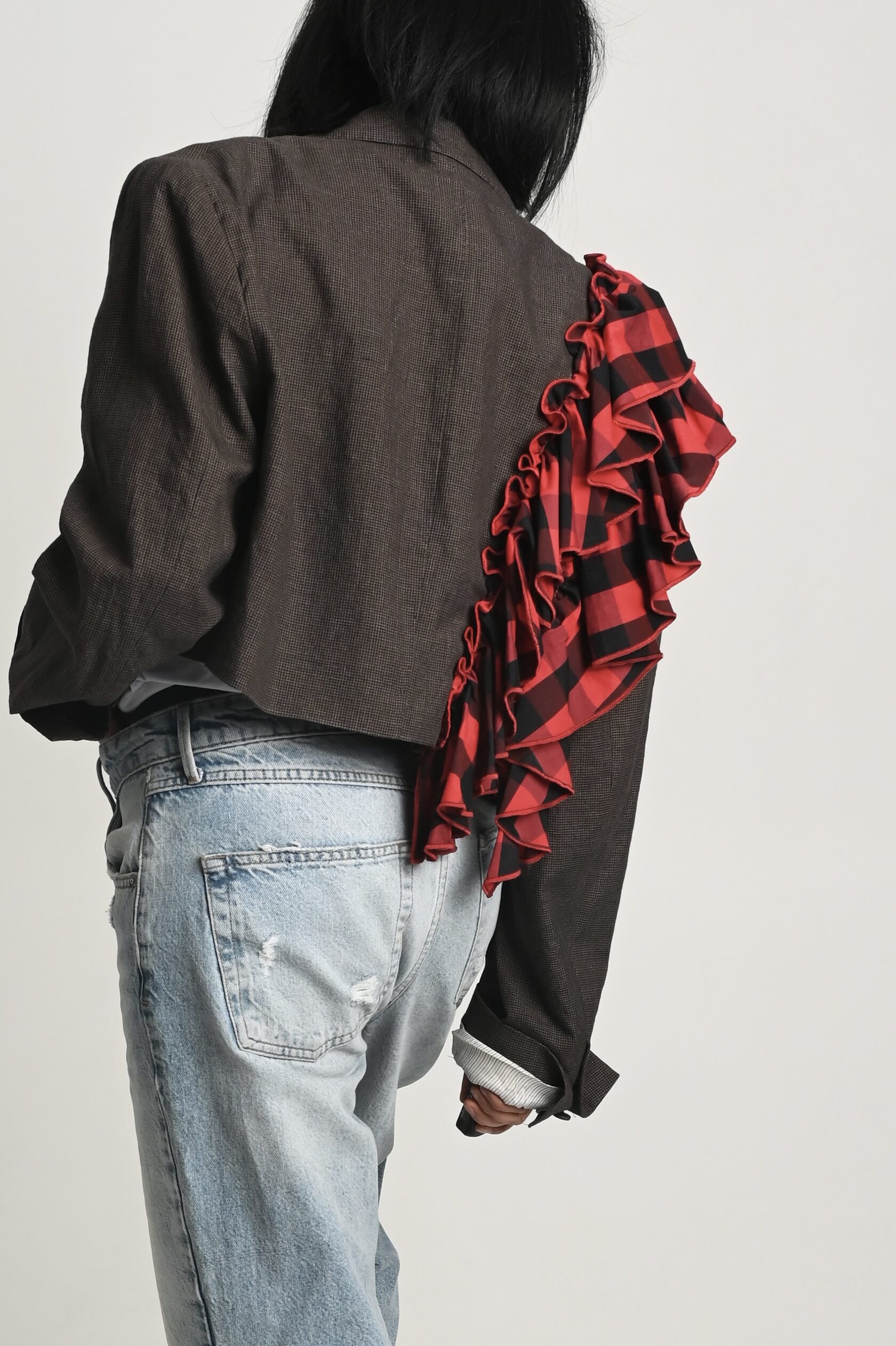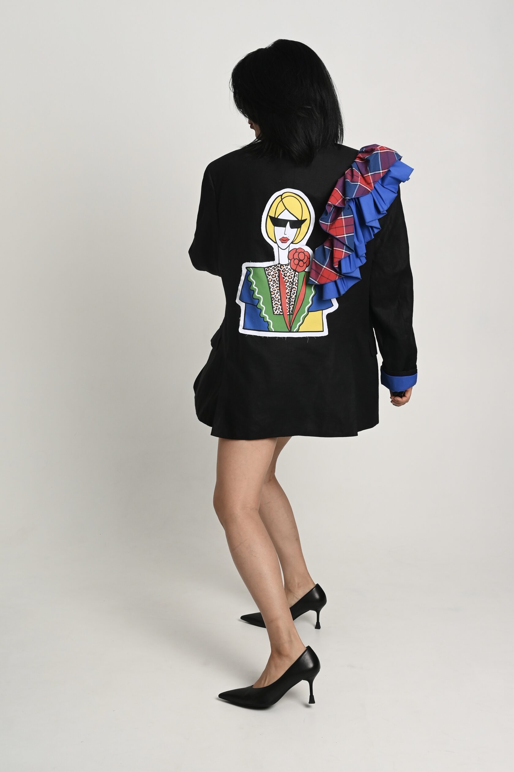 Накинула пиджак на свои хрупкие плечи, поправила волан, оглянулась, окинула себя взглядом.