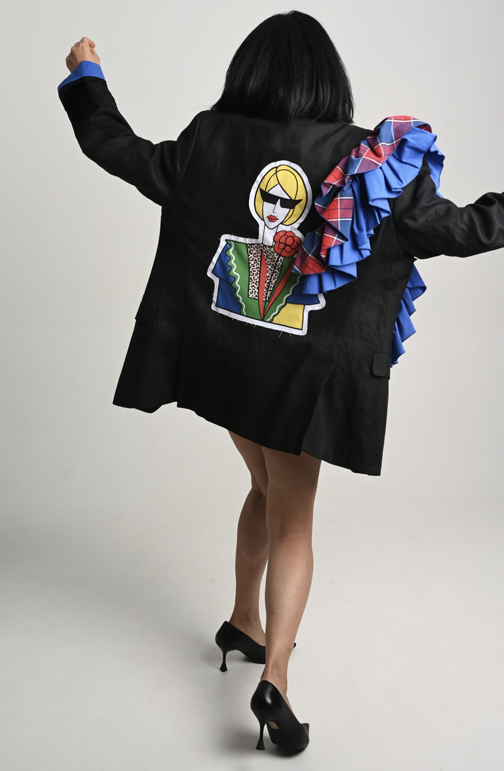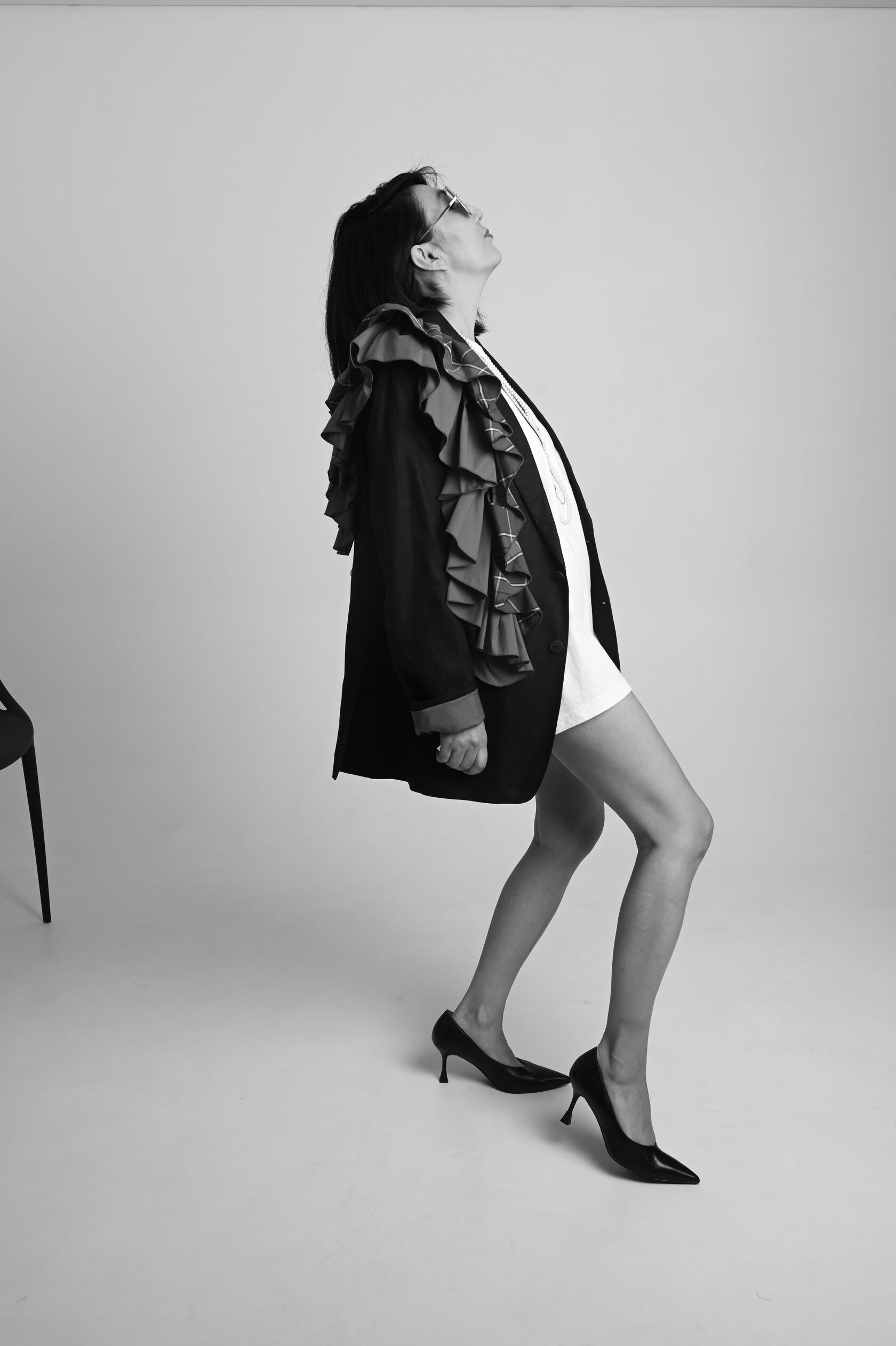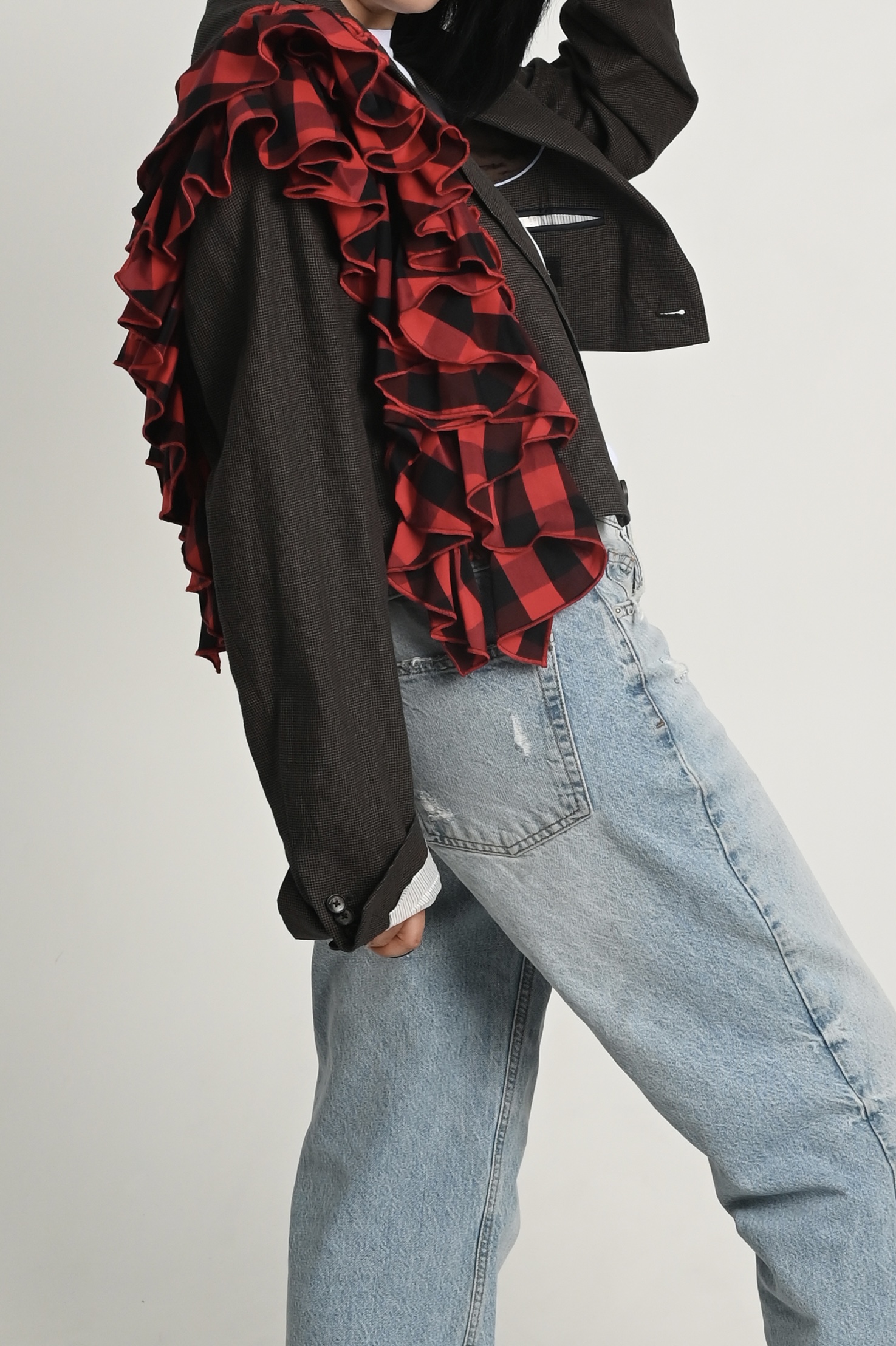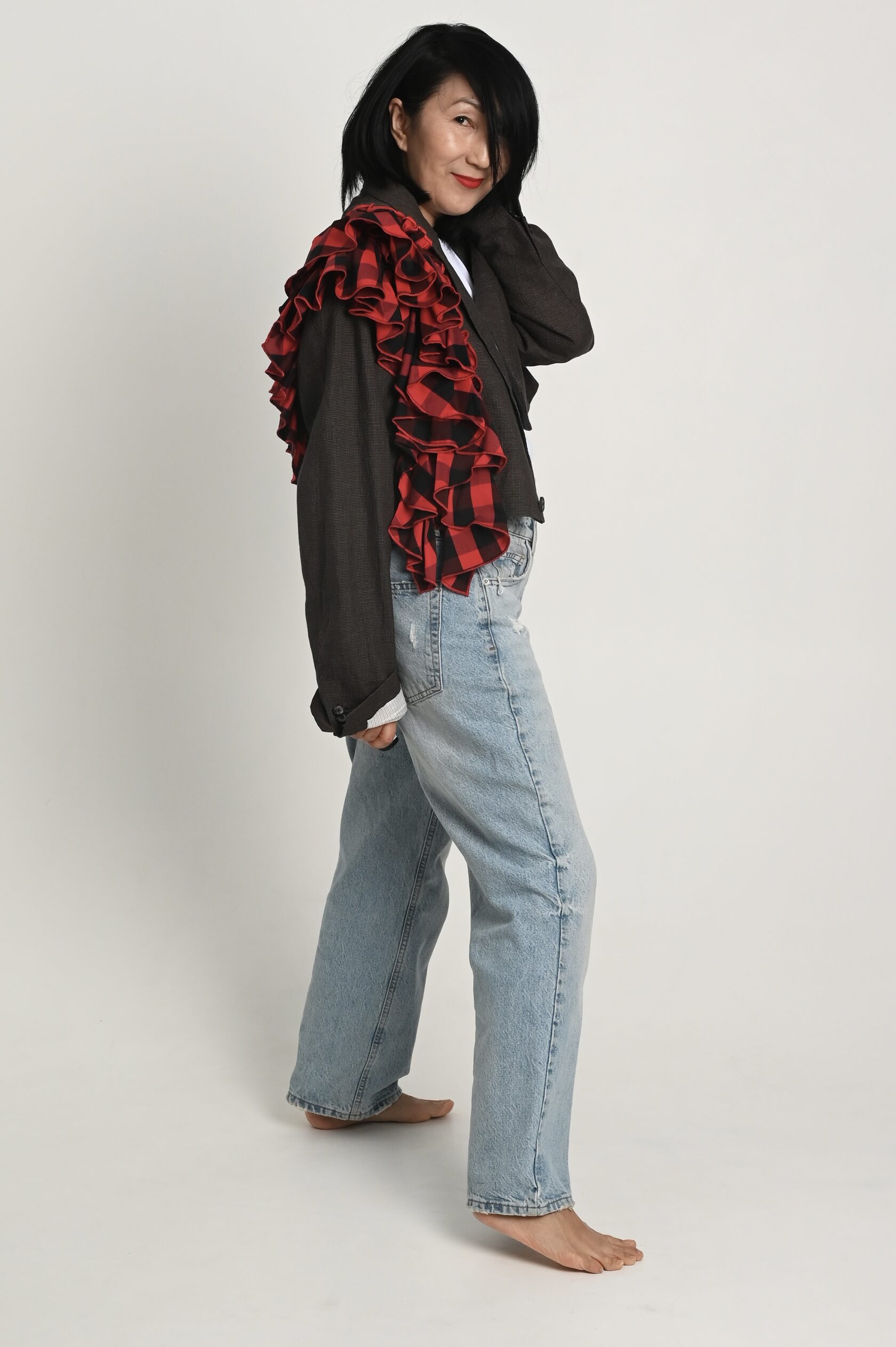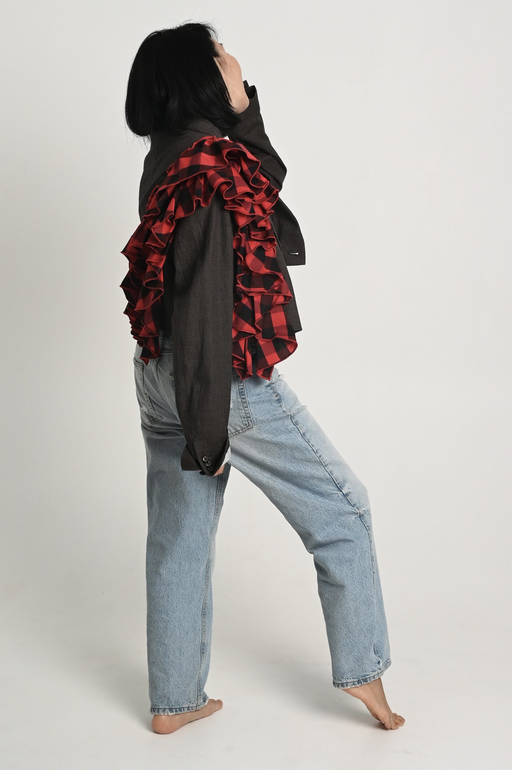 Накинула пиджак на свои хрупкие плечи, поправила волан, оглянулась, окинула себя взглядом.
